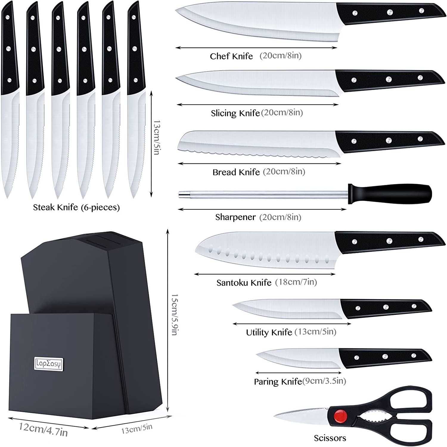 LapEasy kitchen knife set contains all tools you need in kitchen cutting tasks,suitable for both professional and home use.