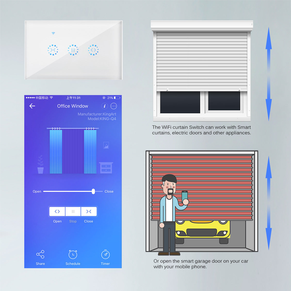 User can use a smartphone to remotely open/close curtain or electrical door at anytime and anywhere via APP as long as the iOS/Android phone has 3G/4G/WIFI network, enjoy the convenience of intelligent life! App: eWeLink.