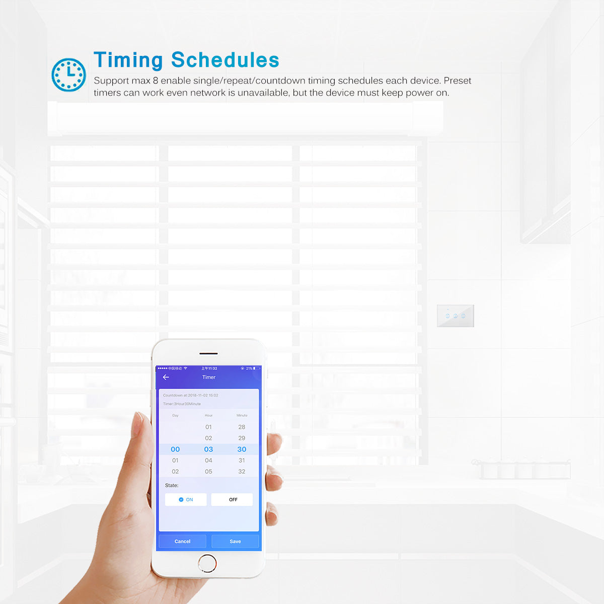 Support max 8 enable single/repeat/countdown timing schedules each device. Preset timers can work even network is unavailable, but the device must keep power on.